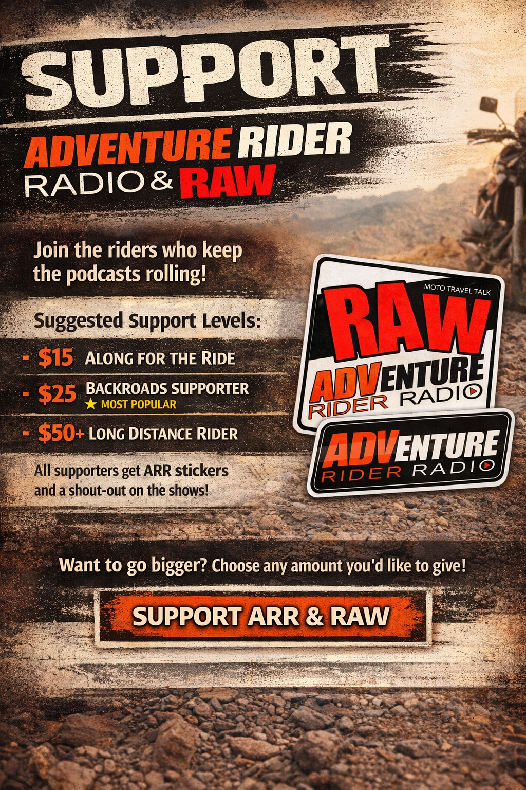 If you value independent motorcycle storytelling, rider skills, and adventure travel discussions, consider supporting the shows and helping keep ARR and RAW on the road.